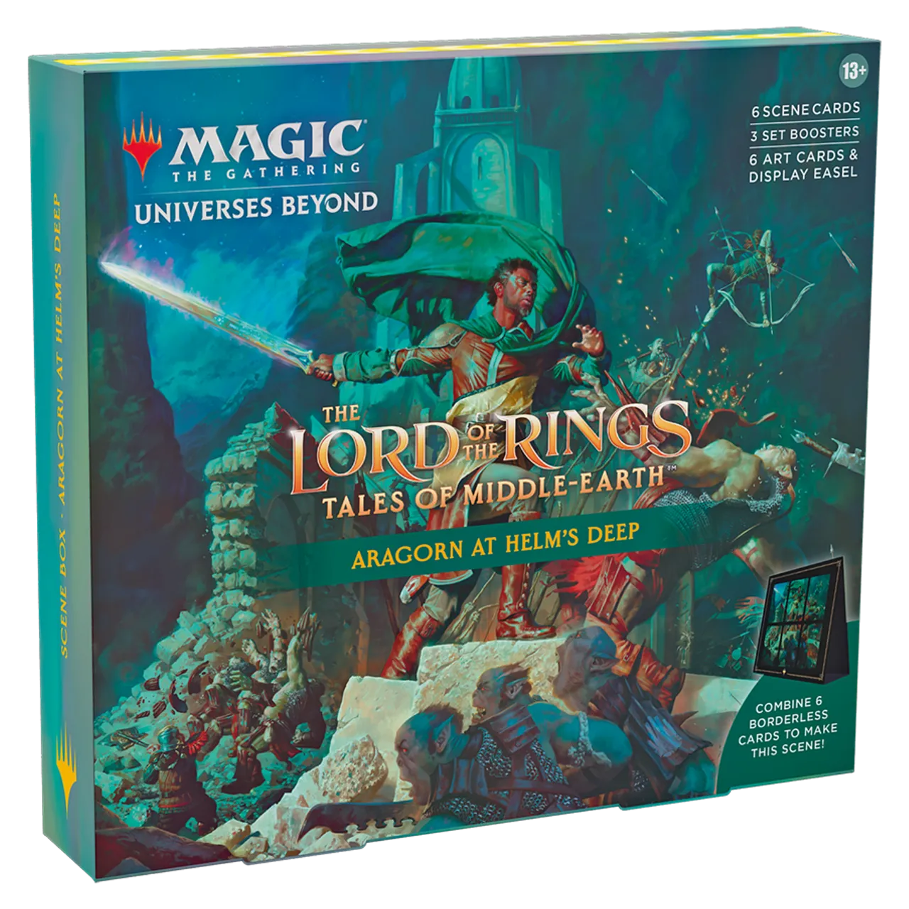 The Lord of the Rings: Tales of Middle-earth™ Scene Boxes contains 6 Traditional Foil Borderless Scene Cards, 6 Art Cards, 3 Set Boosters, and a paper display easel. Each Set Booster contains 12 Magic cards, 1 Art Card, and 1 token/ad card, Helper card, or card from "The List" (a special card from Magic's history—found in 25% of packs), with a combination of 1-4 card(s) of rarity Rare or higher and 3-7 Uncommon, 3-7 Common, and 1 Land cards. A Traditional Foil Land replaces the basic land in 20% of Set Boosters and a Foil-Stamped Signature Art Card replaces the Art Card in 10% of Set Boosters.