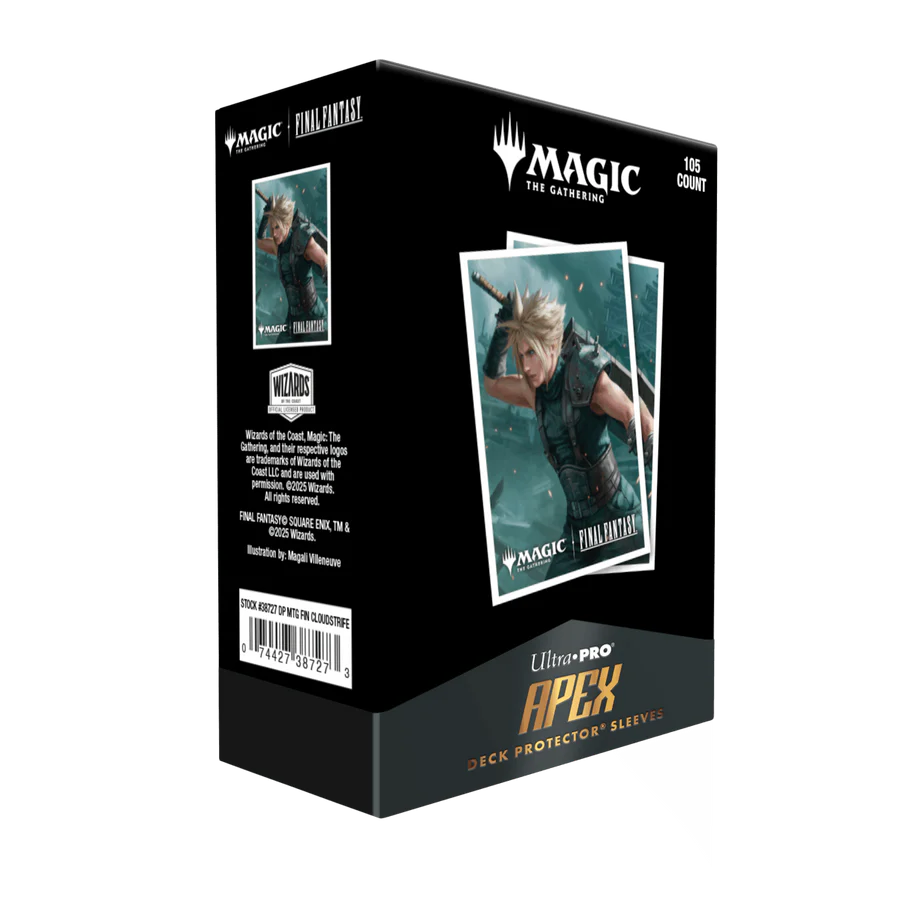 The Magic: The Gathering®—FINAL FANTASY™ Cloud, Planet's Champion 105ct APEX Deck Protector™ Sleeves are made with our new easy-shuffle formulation and feature vibrant artwork on a textured back. Archival-safe polypropylene materials ensure you can sleeve your cards with confidence, and the gloss clear front allows your foil cards to shine! Sized for standard size trading cards measuring 2.5 in. x 3.5 in.