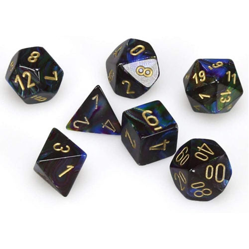 Beautifully crafted dice by Chessex for all your role playing and wargaming needs. Each set contains one each of: D20, D12, D10, D8, D6, D4 and percentage die. Numerals (not pips) are embossed in contrasting colours for high visibility, and rounded corners provide perfect rolling.