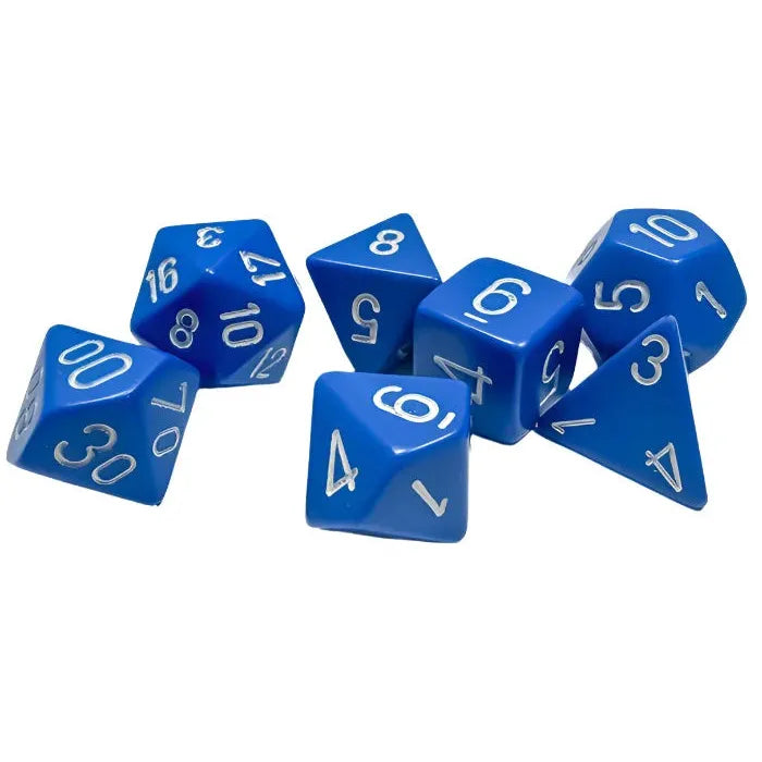Beautifully crafted dice by Chessex for all your role playing and wargaming needs. Each set contains one each of: D20, D12, D10, D8, D6, D4 and percentage die. Numerals (not pips) are embossed in contrasting colours for high visibility, and rounded corners provide perfect rolling.