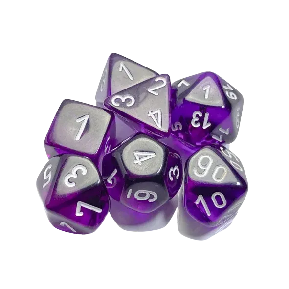 Beautifully crafted dice by Chessex for all your role playing and wargaming needs. Each set contains one each of: D20, D12, D10, D8, D6, D4 and percentage die. Numerals (not pips) are embossed in contrasting colours for high visibility, and rounded corners provide perfect rolling.