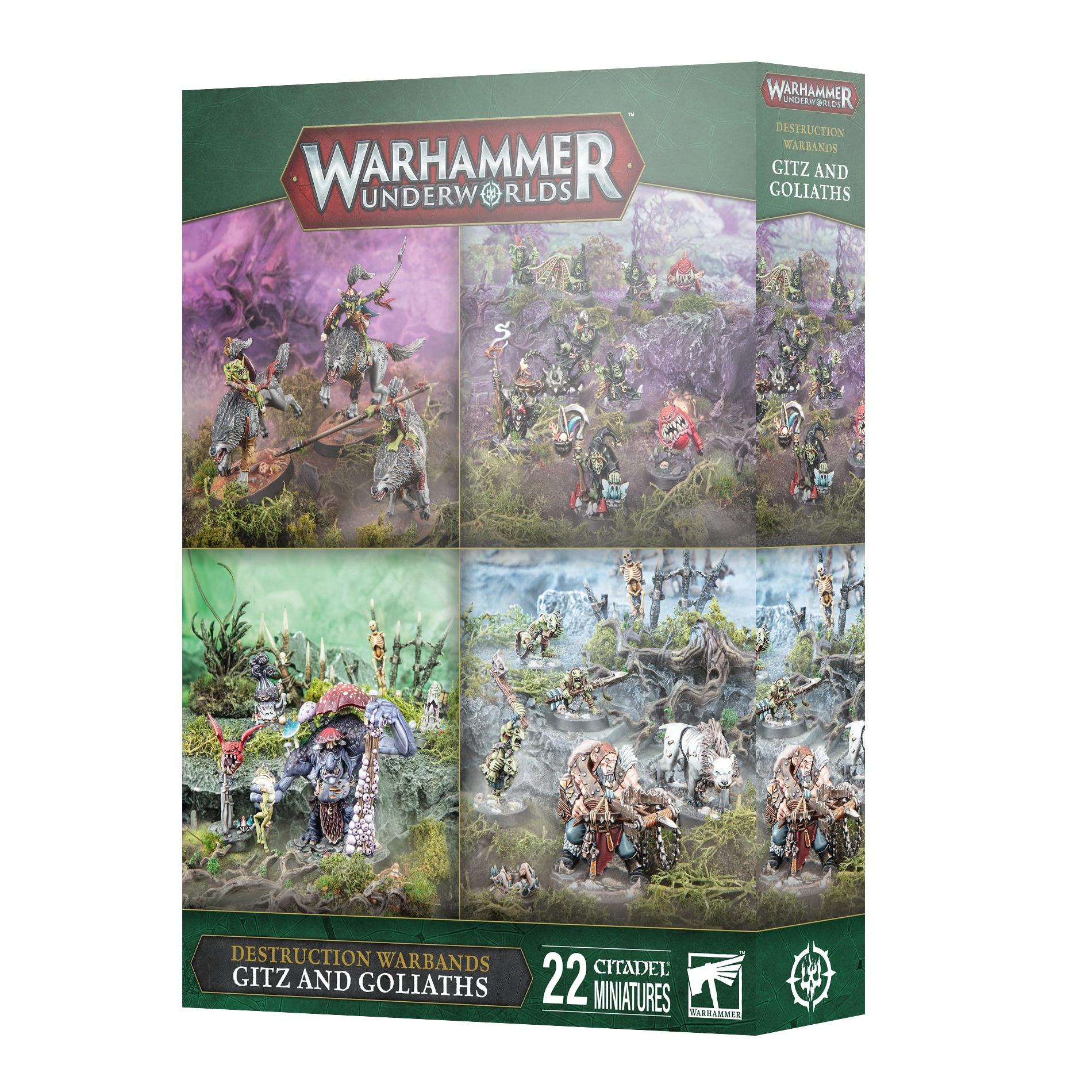 This kit collects four Destruction-themed warbands for Warhammer Underworlds. All the miniatures are push-fit, moulded in coloured plastic, and include scenic bases on the frames so you can start playing quickly. You'll also find warscroll cards and fighter cards for each warband. Hrothgorn's Mantrappers are a versatile Flex warband, Rippa's Snarlfangs are an aggressive Strike warband, Zarbag's Gitz are an ambitious Take and Hold warband, and Mollog's Mob feature the Mastery playstyle, which rewards players for careful management.