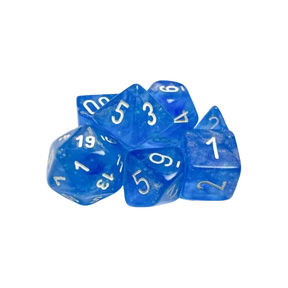 Beautifully crafted dice by Chessex for all your role playing and wargaming needs. Each set contains one each of: D20, D12, D10, D8, D6, D4 and percentage die. Numerals (not pips) are embossed in contrasting colours for high visibility, and rounded corners provide perfect rolling.