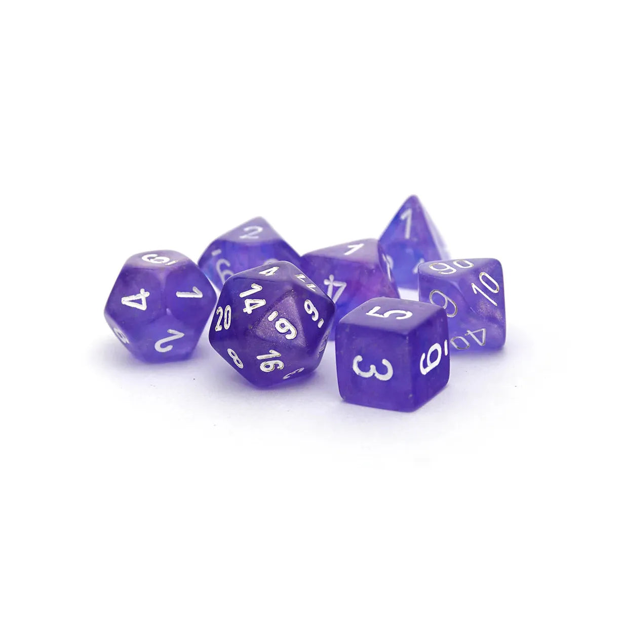Beautifully crafted dice by Chessex for all your role playing and wargaming needs. Each set contains one each of: D20, D12, D10, D8, D6, D4 and percentage die. Numerals (not pips) are embossed in contrasting colours for high visibility, and rounded corners provide perfect rolling.