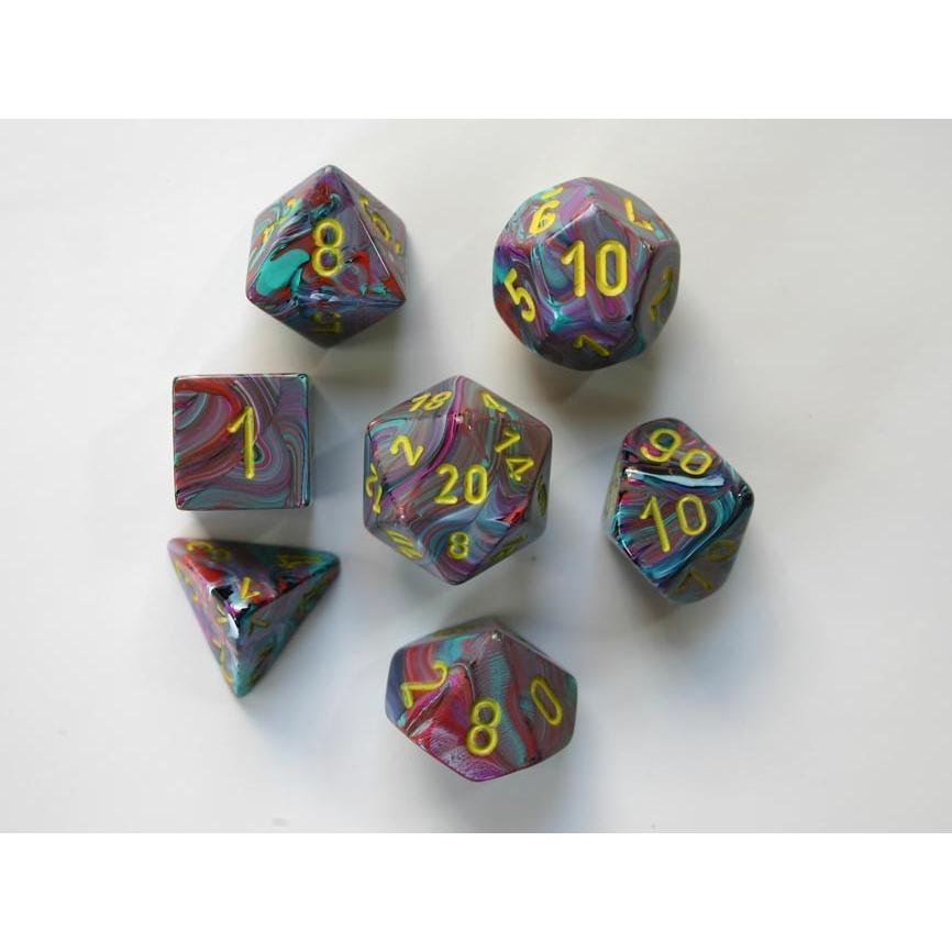 Beautifully crafted dice by Chessex for all your role playing and wargaming needs. Each set contains one each of: D20, D12, D10, D8, D6, D4 and percentage die. Numerals (not pips) are embossed in contrasting colours for high visibility, and rounded corners provide perfect rolling.