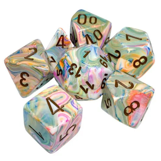 Beautifully crafted dice by Chessex for all your role playing and wargaming needs. Each set contains one each of: D20, D12, D10, D8, D6, D4 and percentage die. Numerals (not pips) are embossed in contrasting colours for high visibility, and rounded corners provide perfect rolling.
