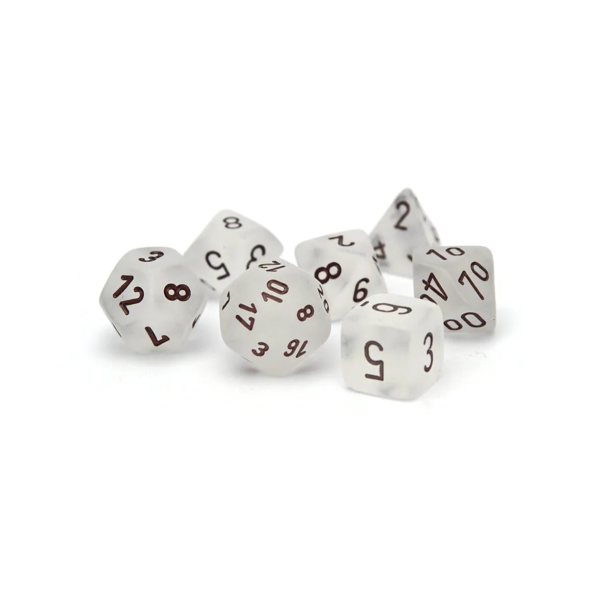 Beautifully crafted dice by Chessex for all your role playing and wargaming needs. Each set contains one each of: D20, D12, D10, D8, D6, D4 and percentage die. Numerals (not pips) are embossed in contrasting colours for high visibility, and rounded corners provide perfect rolling.