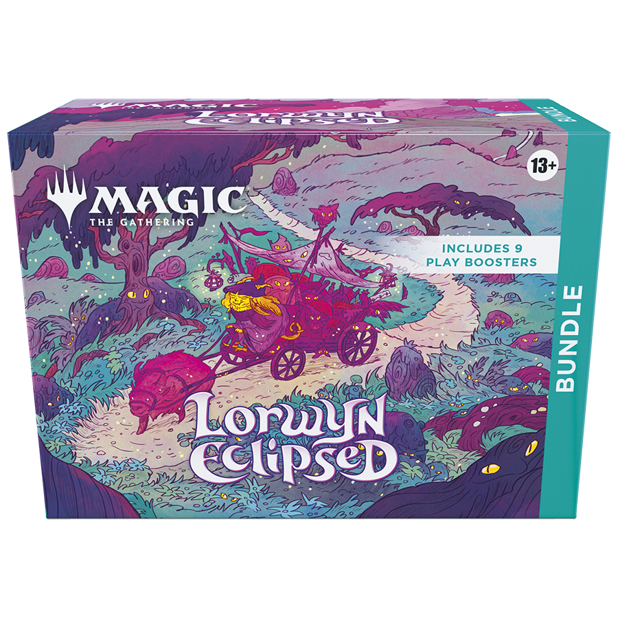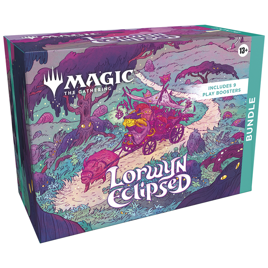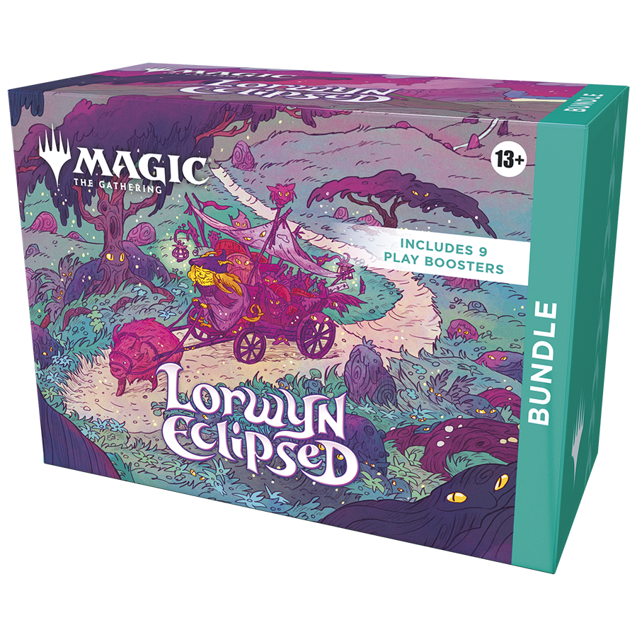- BUNDLE—Includes 9 Play Boosters, foils, a promo card, and a themed spindown die. Everything you need to play and display the world of Lorwyn Eclipsed.