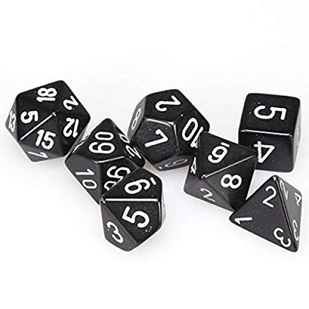 Beautifully crafted dice by Chessex for all your role playing and wargaming needs. Each set contains one each of: D20, D12, D10, D8, D6, D4 and percentage die. Numerals (not pips) are embossed in contrasting colours for high visibility, and rounded corners provide perfect rolling.
