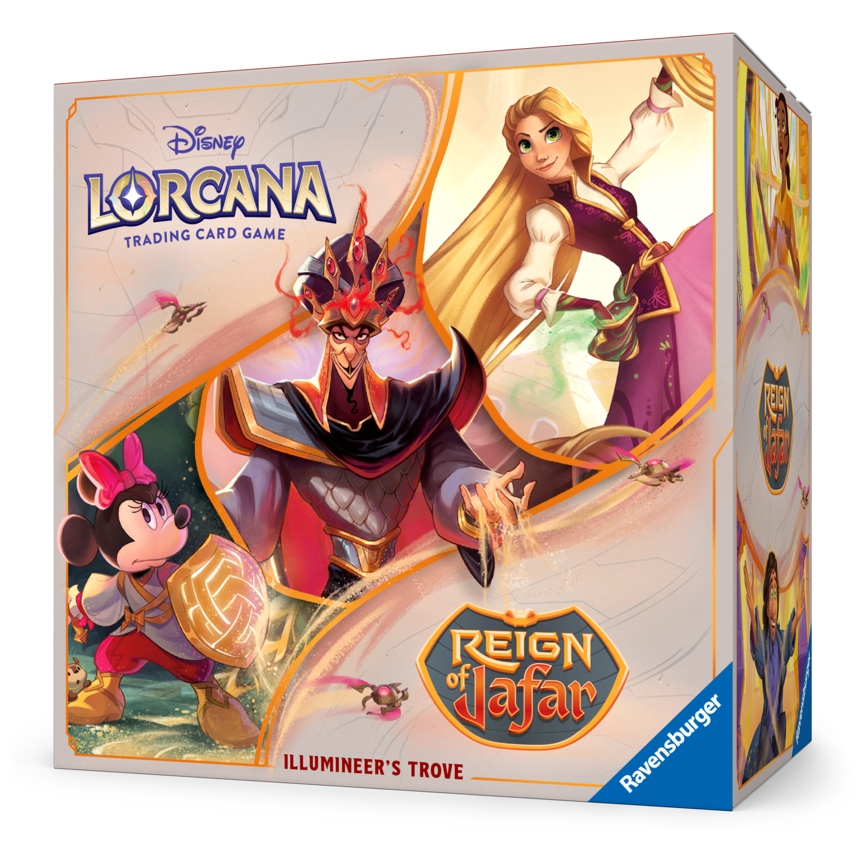 The ultimate treasure for both collectors and players, the Illumineer’s Trove contains a full-art storage box with seven card dividers to keep your Disney Lorcana TCG cards safe and organized by ink. The Illumineer’s Trove includes eight Booster Packs and helps keep track of character and location damage with six dice featuring a hypnotic sandy effect. With the spin-dial counter, players will never question how close they are to claiming a story star as it lets them easily track their progress toward victory!