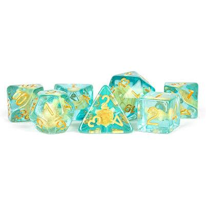 FanRoll resin dice have unique inclusions that add flare to any gaming table. These are full-sized 16mm polyhedral dice sets that come with 7 dice (d4, d6, d8, d10, d10%(00-90), d12, and d20).