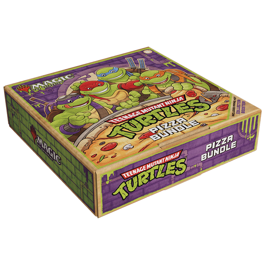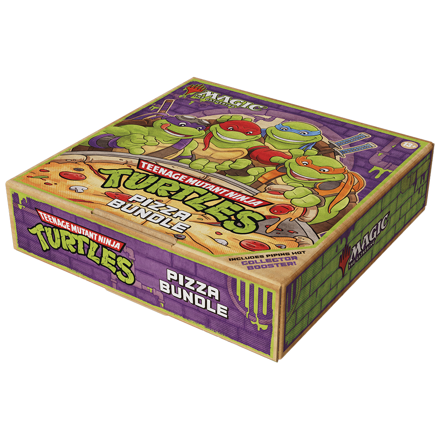 Calling all TMNT and Magic fans: Any way you slice it, this hot and fresh bundle really delivers! Once you open the lid, you'll be greeted with nine Turtle-tastic Play Booster packs, 25 basic lands, an oversized Spindown™, full-art pizza basic lands, and pizza-themed promo cards of classic Magic spells. Don't forget the cherry (tomato) on top—a Collector Booster stuffed with rares and foils!