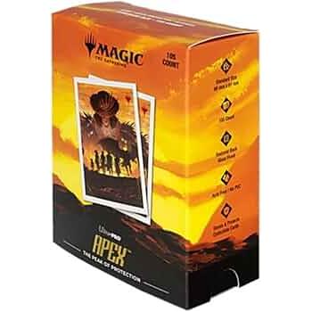 105ct Apex Deck Protector sleeves for Magic: The Gathering feature a vibrant, full-colour artwork and are made with UltraPro proprietary ChromaFusion Technology to prevent peeling. Archival-safe polypropylene materials ensure you can sleeve your cards with confidence. Sized for standard size trading cards measuring 2.5 in. x 3.5 in. The matte finish offers a glare-free, camera ready play experience!